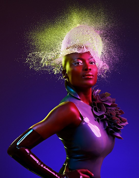 Как и в прошлый раз, художник начинал опыты с помощью компьютерного моделирования причёски, а затем, в её воплощении в жизнь ему помогали ассистенты и качественное фотооборудование. Так, фотокамера настраивается специальным образом, чтобы зафиксировать строго момент лопания воздушного шарика, наполненного водой, что и приводит к столь оригинальному эффекту волос из брызг и мельчайших водяных капель.