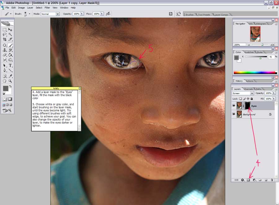 5. Теперь выберите белый цвет (также можно любые градации серого, если хотите добиться прозрачности) и начинайте закрашивать глаза до тех пор, пока они не посветлеют. Используйте разные размеры кистей, чтобы добиться нужного эффекта. Можно также менять прозрачность кисти или слоя, чтобы сделать глаза светлыми или наоборот более темными.