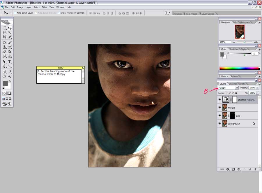 8. Выберите channel mixer и установите режим смешивания на multiply.