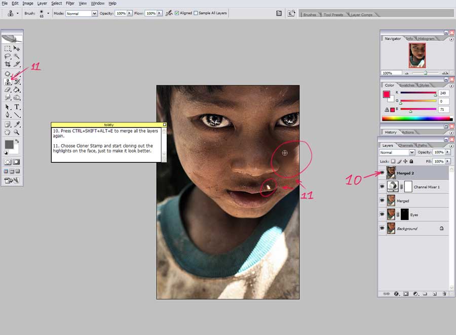 11. Далее я выбрал Cloner Stamp на панели инструментов и закрасил лишние блики на лице парня. Для вашей фотографии это может и не понадобится, так что пропустите этот этап.