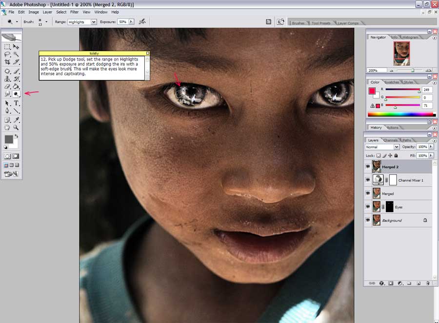 12. Выберите Dodge Tool, установите Range — Highlights и Exposure — 50%. Начните вырисовывать радужку глаза, чтобы сделать глаза более выразительными. Тут главное не переусердствовать, потому что может получиться полная жесть)