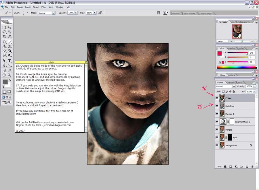 16. Наконец, объединяем слои (CTRL+SHIFT+ALT+E) и немного шарпим картинку. Можете сделать это любым способом, какой вам больше нравится: Sharpen, Unsharp Mask, Smart Mask и т.д. Я лично люблю делать дубликат слоя, ставить его в режим Soft Light и применять фильтр High Pass с минимальными значениями.