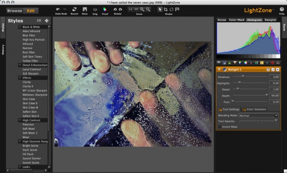 Программа располагает мощным инструментом редактирования некоторых полей метаданных, но с точки зрения организации работы с фотоархивами значительно уступает таким гигантам, как Aperture и Lightroom. Особенностью LightZone является набор «стилей» обработки: High Dynamic Range (HDR-обработка), Contrast and Pop (в стиле поп-арт), Lomo Look (ломография) и другие. Стили — не просто набор конкретных параметров. Применяя одну из предустановок, вы запускаете алгоритм автоматической обработки, который учитывает свойства исходного файла, даже когда речь идет о пакетной обработке данных. Стили можно объединять в группы (папки) и даже обмениваться ими, как Actions в Photoshop.