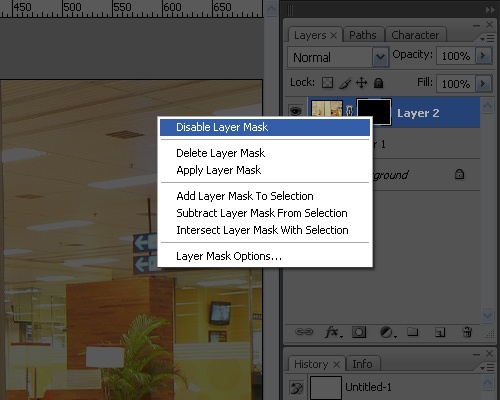 Щелкните правой кнопкой мыши на векторной маске, и выберите Disable Layer Mask (Отключить Маску Слоя). Это позволяет Вам временно отобразить верхний слой.