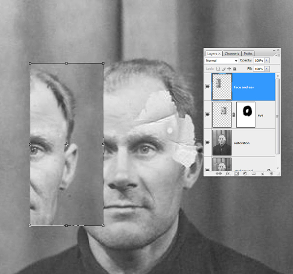 Теперь, перетащите выделение на место, где должен находиться левый глаз, уменьшите прозрачность и выравняйте его относительно места, откуда он был вырван. Когда вы закончите, нажмите enter, или нажмите на область, выделенную зеленым чтобы подтвердить изменения. Потом поднимите прозрачность до 100%.