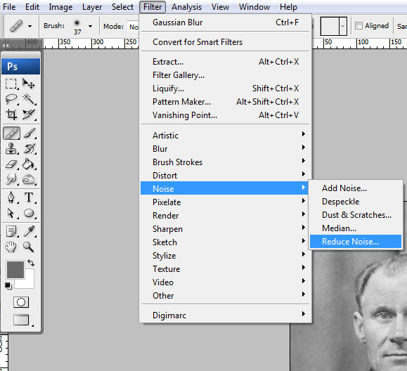 Теперь мы попытаемся понизить уровень шума. Борьба с шумом может вестись разными путями, но здесь я использую фильтр Уменьшить шум (Reduce Noice) из вкладки Шум (Noice). В этом уроке я немного переусердствовал с шумоподавлением, и если мне не изменяет память, то мои значения силы были 8 единиц, и что-то около 20 единиц для деталей.