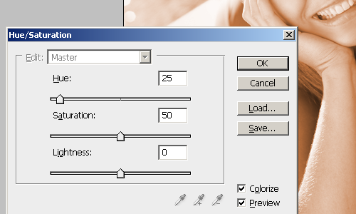 У вас откроется окно Hue / Saturation. Во-первых, отметьте опцию Раскрасить (Colorize) ближайшем нижнем правом углу. Сделайте настройки такими же, как на изображении ниже, а затем нажмите кнопку ОК.