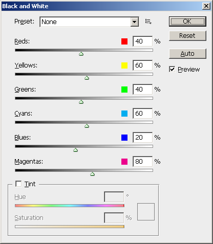У вас появятся параметры слоя Чёрно-белое (Black & White) или Mixer (Для тех, кто использует Photoshop CS2 или старше). Просто нажмите «ОК» с любыми настройками. Для изменения настроек мы вернёмся позже… :)
