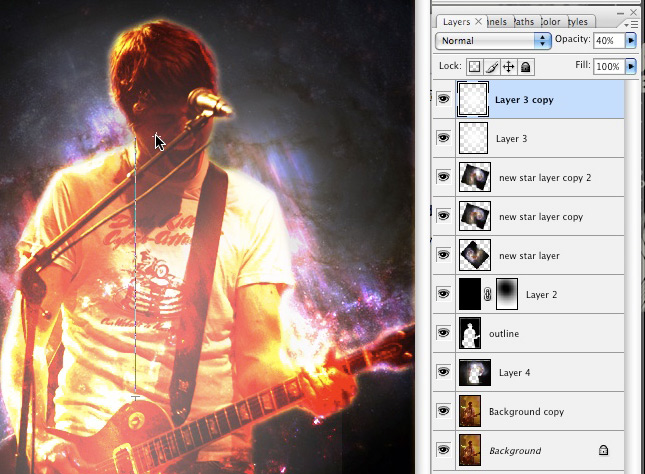 Добаим чуть-чуть света. Для этого выберем инструмент градиентной заливки (Gradient). Выберите радиальный градиент. Выберите белый цвет. Теперь примените ваш градиент, чтобы перекрыть половину тела гитариста. Измените прозрачность на 40%. Повторите этот шаг, если требуется.