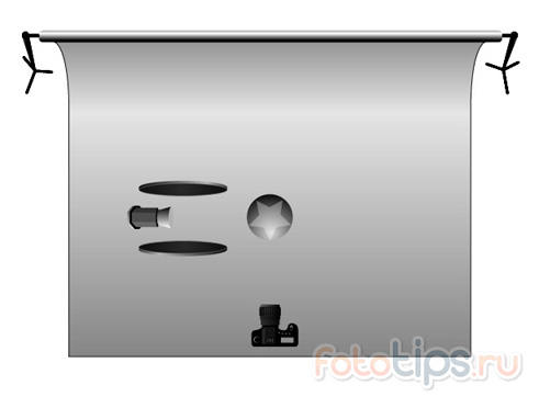Главная задача фотографа – осветить дым, создав фон максимально чёрным. Чёрный фон наиболее благоприятен для выбора правильной экспозиции, а также удобен при дальнейшей пост-обработке снимка на компьютере. Источник освещения должен быть небольшим, а сам фон располагаться достаточно далеко. Примерная схема постановки света выглядит так: