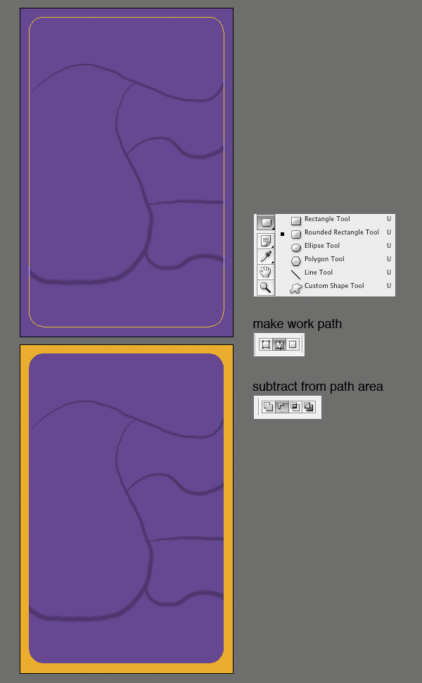 Фон залейте фиолетовым цветом. Затем берем Rounded Rectangle Tool(U). Убедитесь, что make work path включено на панели настроек. Выделите область, как показано на рисунке. Теперь берем pen tool (P), держа Ctrl, перетаскиваем курсор, чтобы выделить путь. Затем жмем subtract for path area в меню настроек. Заливаем выделение оранжевым цветом.