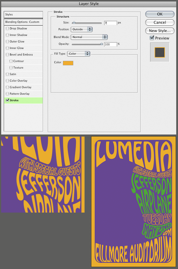 Теперь изменим цвет некоторого текста. Сначала изменяем цвет текста ‘with special guests’ на белый. Меняем режим смешивания слоя на Multiply. Двойным кликом на слой с этим текстом, вызываем меню стилей. Выбираем пункт Stroke. Ставим настройки, показанные на рисунке ниже. Также изменяем цвет другого текста, я выбрал зеленый. Результат вы можете увидеть на рисунке ниже.