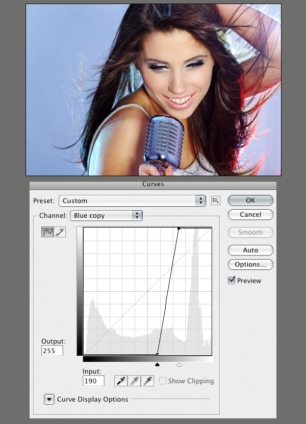 Теперь нужно вставить в свободную область женщину. После успешной вставки фотографии с женщиной в наш документ, переходим на палитру каналов. Дублируем каналы "Blue" и "Red". Применяем к ним Image > Adjustments > Curves с ниже показанными параметрами.Затем инвертируем их, выбирая их по отдельности и нажимая Ctrl+I.