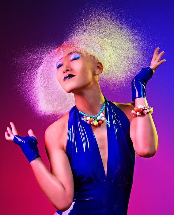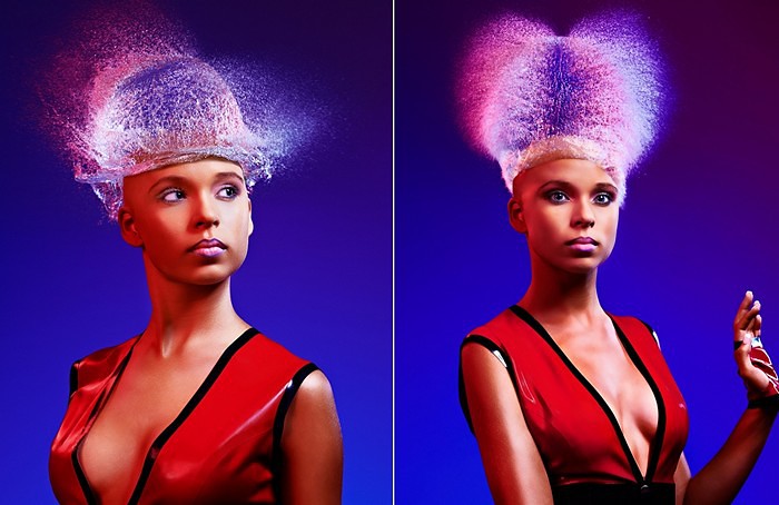 Как и в прошлый раз, художник начинал опыты с помощью компьютерного моделирования причёски, а затем, в её воплощении в жизнь ему помогали ассистенты и качественное фотооборудование. Так, фотокамера настраивается специальным образом, чтобы зафиксировать строго момент лопания воздушного шарика, наполненного водой, что и приводит к столь оригинальному эффекту волос из брызг и мельчайших водяных капель.