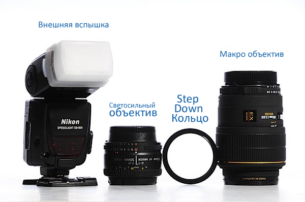 Что касается вспышки, то её надо будет отсоединить от фотоаппарата из-за длинны сложного объектива и близости к нему предмета.