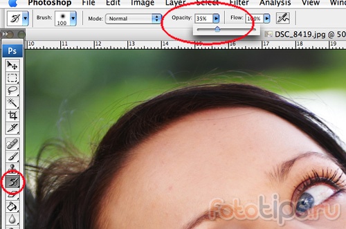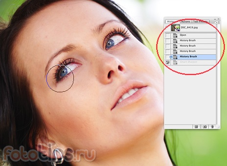 Берем History Brush Tool (Y), уменьшаем саму кисть и прозрачность до нужного нам результата.