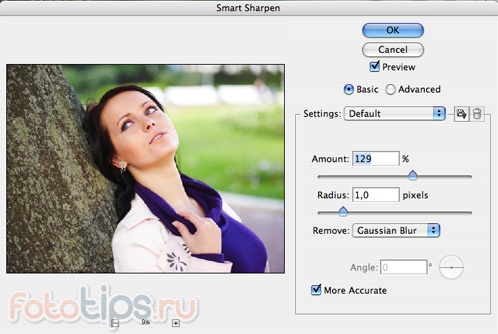 Применяем Filter > sharpen > smart sharpen. Настройки делаем свои, как больше нравится.