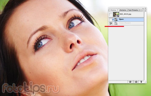 Далее смотрим History, и возвращаемся на шаг назад (по идее это «open») и при этом выделим галочкой (а точнее такая маленькая кисточка, слева) шаг с резкостью.