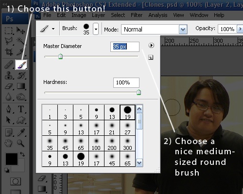 Выберите инструмент Brush (Кисть) (нажмите кнопку B ), и выберите жесткую круглую кисть размером примерно 35 пикселей (зависит от Ваших изображений).