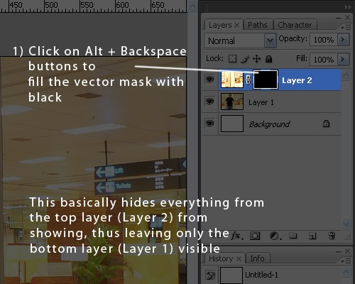 Не кликая после Шага 8 где-нибудь еще, нажмите Alt + Backspace, чтобы заполнить векторную маску черным. (Опция + Возврат на один символ для пользователей Макинтоша). Если Вы все же кликнули где-то в другом месте, удостоверьтесь, что Вы нажимаете на векторную маску, прежде чем нажать Alt + Backspace. Это действие скрывает верхний слой от отображения. Следующие шаги позволят отображать только определенные части верхнего слоя.