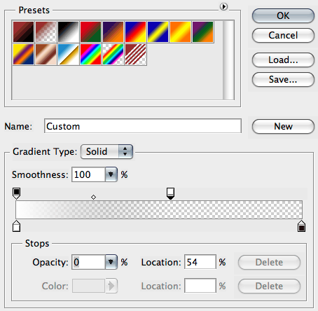 Кликните на Gradient что бы открылось новое окно. Здесь Вы должны будете двигать верхнюю правую стрелку к середине это сузит градиент.