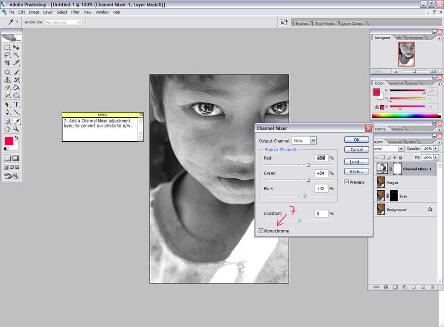 7. Добавьте Channel Mixer, чтобы перевести фотографию в ЧБ. Для каждой отдельной фотографии настройки могут быть разными, так что не надо копировать значения с моего варианта :)