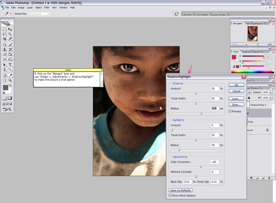 9. Теперь выберите наш объединенный слой и примените Image -> Adjustments -> Shadow/Highlight для того, чтобы выровнять тени и светлые участки.