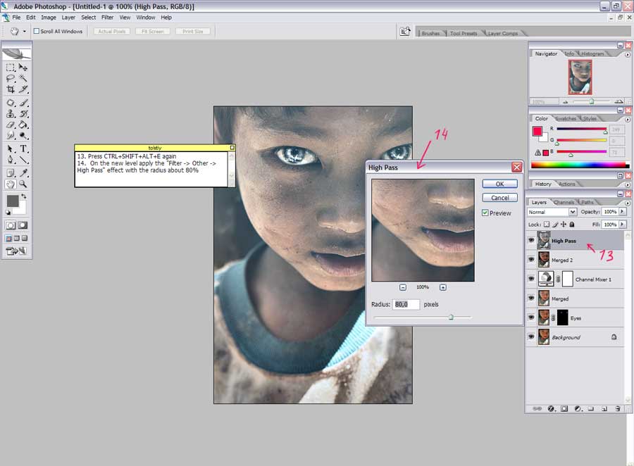 13. Снова объединяем все слои (CTRL+SHIFT+ALT+E) 14. На новый слой применяем Filter -> Other -> Hig Pass. Я выставил значение примерно 80%, но для фотографий с разным разрешением, значения могут быть разные. Так что опять же подбираем на глаз.