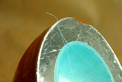 Теперь задача – укрепить маленькую тарелку перед большой так, чтобы исключить прямой свет от вспышки. Подвешиваю ее просто на нитяных растяжках, сделав дырки для нитки в пластмассе с помощью паяльника.