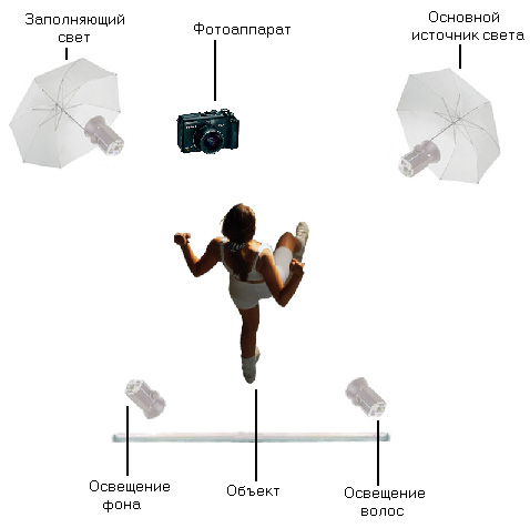 Освещение волос Освещение волос обычно представляет собой небольшое освещение, направленное на волосы объекта для обеспечения привлекательного подчеркивания сил) эта объекта. Часто, чтобы удержать освещение волос от падения вниз на лицо объекта, используется тубус или шторка осветительного прибора. Освещение волос должно тщательно контролироваться, так чтобы оно не формировало передержанный участок на голове объекта.