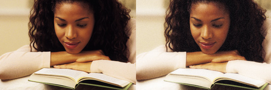 Освещение «бабочка» Освещение «бабочка» является одним из оригинальных эффектов освещения, подчеркивающих привлекательность объекта. Основной свет устанавливается непосредственно напротив лица выше уровня глаз и бросает тень ниже уровня носа. Это великолепная техника освещения, используемая при съемке женщин. Освещение «бабочка» подчеркивает уши, что делает его неподходящим для мужчин и женщин, чья прическа представляет собой волосы, стянутые сзади и открывающие уши. На рисунке 7.9 показан портрет с базовой техникой освещения «бабочка» слева и конечный результат с добавлением небольшой диффузии справа. Обратите внимание, что уши не были проблемой на этом портрете, поскольку они спрятаны за волосами модели.