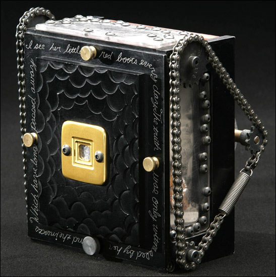 Камера «Стрекоза», созданная как алтарь в память о девочке, скончавшейся в возрасте девяти лет. Материалы: сталь, алюминий, акрил, насекомые, цветочные лепестки, старинные игрушки, страницы книг.