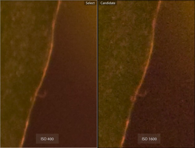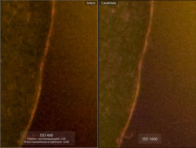 Слева показан кадр, где ISO400 снято с экспокоррекцией -2, с пост-процессингом, при котором экспокоррекция была выставлена +2. В итоге можно заметить повышенный контраст и большее количество шума, чем при стандартном ISO1600.
