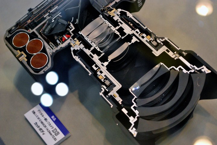 С 11 по 13 декабря в Токио проходила выставке Eco Products. На одном из стендов компании Nikon расположился довольно интересный образец, это камера Nikon D3 с объективом 14-24mm f/2.8 G Nikkor разрубленные пополам. Завораживающее зрелище, особенно интересно смотрятся линзы в объективе.