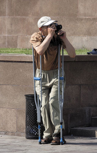 5. Ну, а если все таки пришлось снимать на пределе, то риск шевеленки можно таки снизить правильным обхватом камеры, это когда левая рука снизу поддерживает объектив, выполняя роль некоего монопода. Правая рука прочно держит камеру за ухват под кнопкой спуска и обе руки локтями прижаты к туловищу. Кстати, по такому обхвату я обычно сужу о степени фотографической зрелости человека с этим самым фотоаппаратом. Так же рекомендуется выпрямить и слегка расставить ноги, телу придать компактную позу (т.е. все также не растопыривать локти) и по возможности прислонится плечом к твердой поверхности (стена/скала/дерево, поддатый друг не пойдет). Можно попробовать найти опору для локтей (периллы, забор) или при съемки с нижнего ракурса лечь животом на землю и также упереться в неё локтями. Еще один совет от американского фотографа Рона Резника: удерживая камеру правой рукой, поместите её на сгиб выставленного вперед локтя левой руки и возьмите руки в «замок». При съемке выше приведенными способами, рекомендую делать серии по 3-4 кадра, покрайнемере один получится резче остальных.