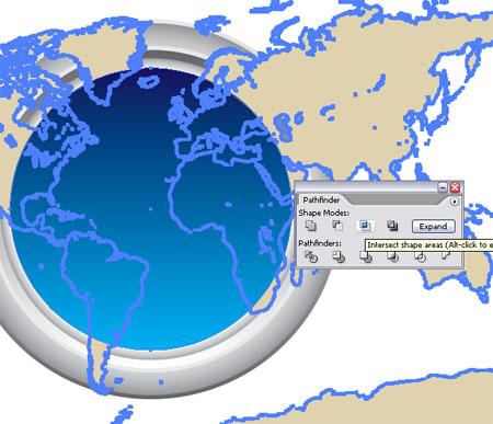Возьмите free vector map из недавнего поста, откройте в Illustrator и вставьте в ваш документ. Используйте копию синего круга наряду с опцией Intersect From Shape Area из панели Pathfinder чтобы убрать излишества.