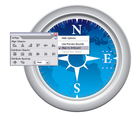 В продукте Apple нет подобное рефлексии. Вставьте белый круг перед лицевой стороной компаса, нариусуйте в добавленной форме Subtract из Shape Area в Pathfinder Tool.