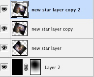 Зажмите Ctrl и кликайте правой клавишей мыши на слое с «черным контуром объекта» (второй сверху), затем идите в Выделение > Инверсия (Select>Inverse). Выбираем слой со звездами и жмем Del. Картинка должна выглядеть примерно так :