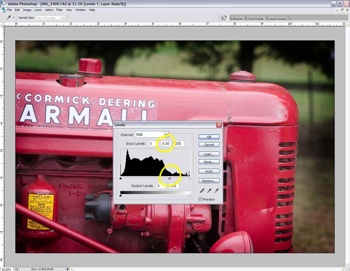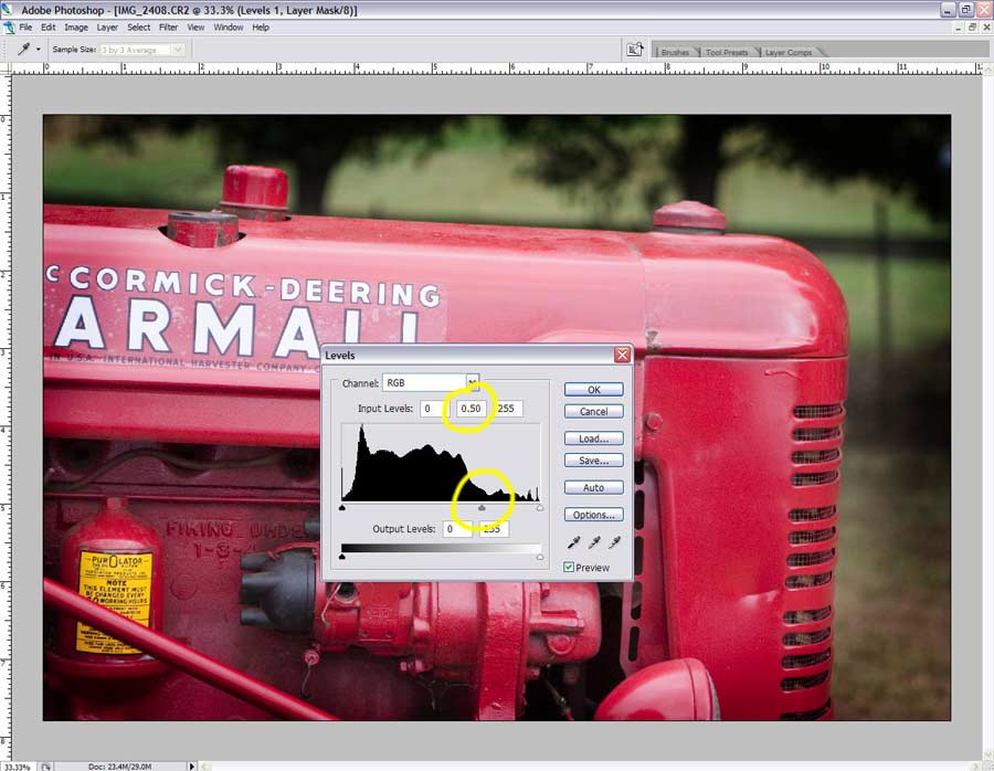 Поверх базового слоя получился слой-маска. Теперь я работаю с уровнями, двигаю среднюю стрелку направо. Это затемняет края, создавая таким образом виньетку. Насколько сильно следует затемнять — зависит от вашего видения. Я сдвинул стрелку от 1.00 до 0.50 в центре, как показано на изображении ниже.