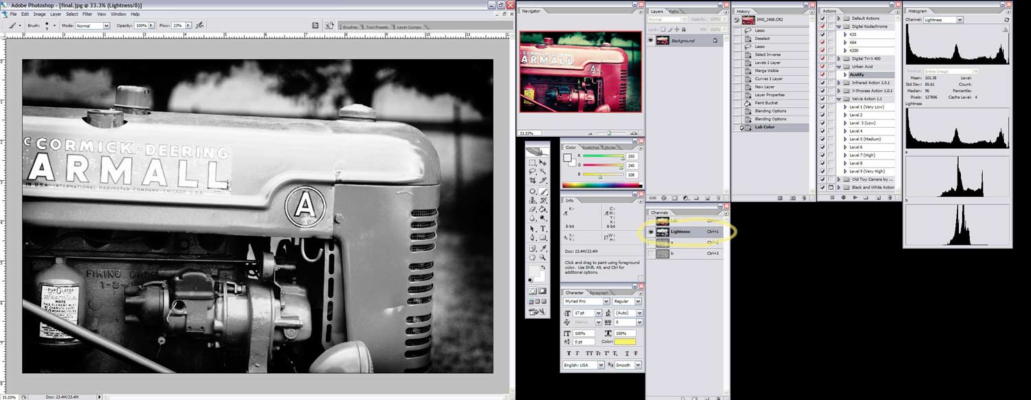 Перед тем, как сохранить результат в JPG, нужно повысить резкость фотографии. Моя техника заключается в том, что я сперва перевожу изображение в цветовой режим Lab, а затем использование Unsharp Mask в канале Lightness. Смысл этого шага в том, что он добавляет вашей картинке контрастности и затемняет кое-какие зоны. Вы можете повысить резкость любым другим способом, просто тот, что я описываю, предотвращает появление светлых границ вокруг краёв изображения, которым чреваты некоторые другие техники.
