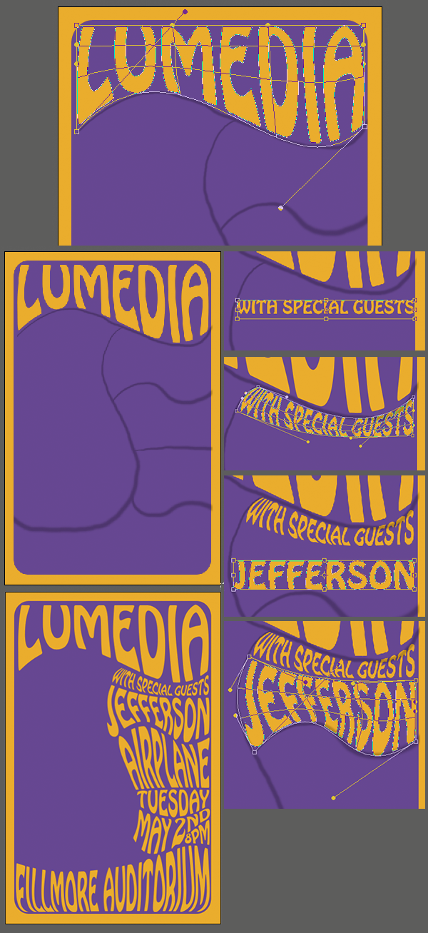 Теперь добавляем текст. Я использовал шрифт Hobo Std. Берем text tool (T) и набираем нужный текст. Жмем Ctrl+T и трансформим текст так, чтобы он "вписался" в первую зону. Кликаем правой кнопкой мыши на слой с текстом и выбираем convert to shape. Это превратит ваш текст в шейп.